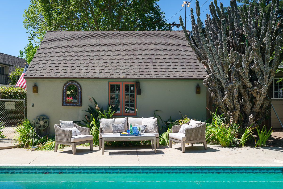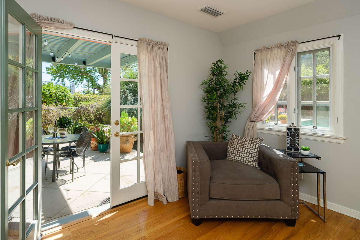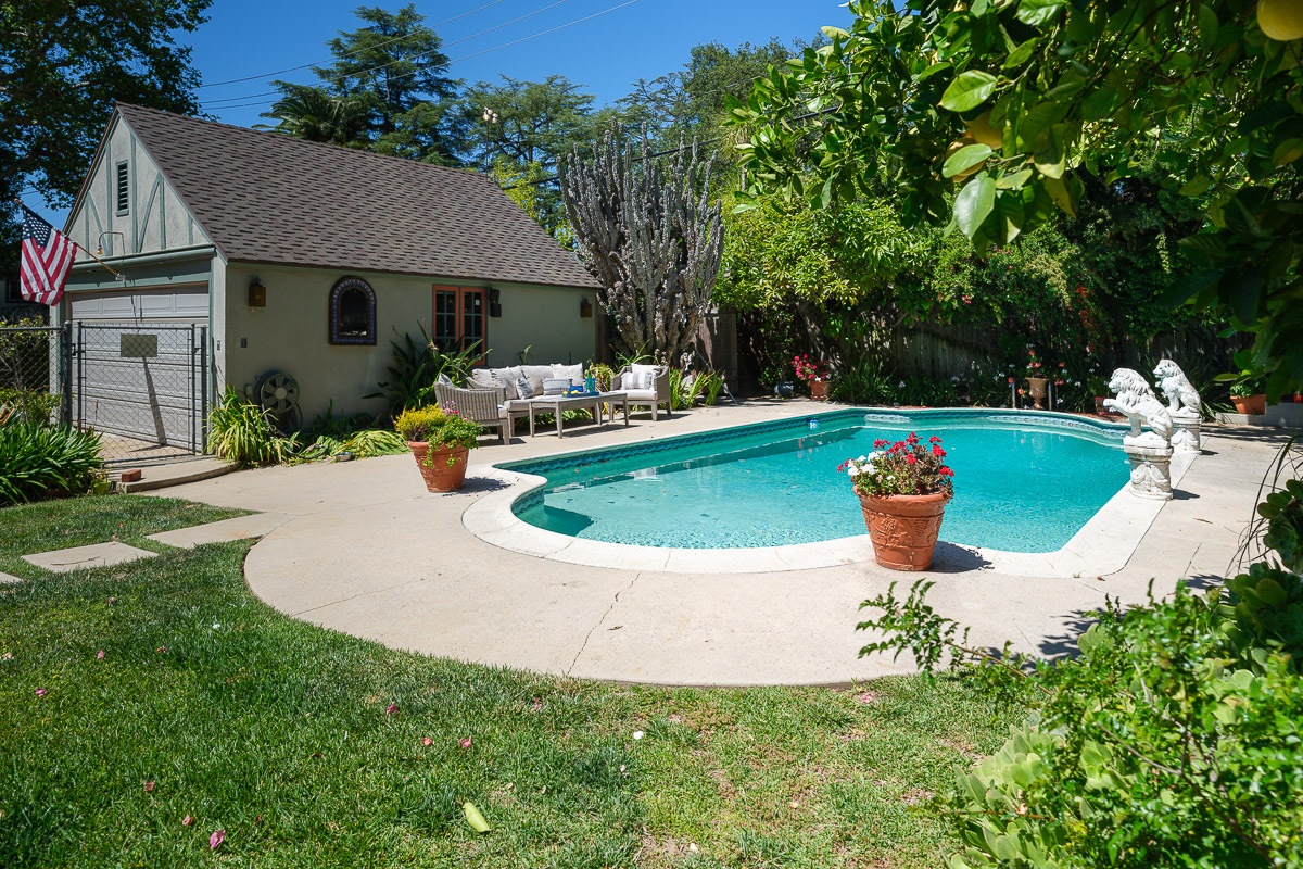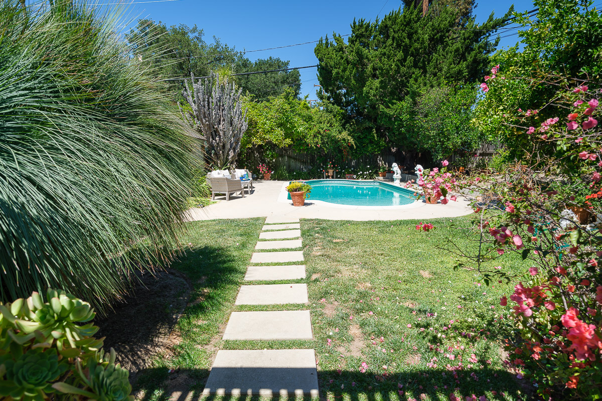 There are three bedrooms including an expansive master suite with a remodeled bath and doors that open to the shade dappled patio. There are two additional bedrooms, including the third bedroom that is used as a den and opens out, via French doors, to the expansive backyard that overlooks the incredible garden that wraps the sparkling pool. The grounds including mature fruit trees as well as an abundance of roses that make this home picture-perfect both inside and out. Don’t miss this gem in one of area’s most sought-after neighborhoods.
